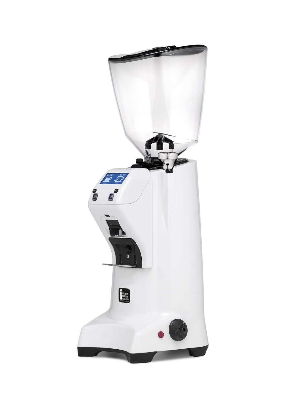 Professionelle On Demand Espressomühle, mit neuen 75 mm High Speed Mahlscheiben und 825 W Motor, 1,5 kg Bohnenbehälter, 4-Punktaufhängung für Motor und Getriebeeinheit, stufenlose Mahlgradverstellung durch Drehpoti, digitale Portionierelektronik für einfache und doppelte Portion, Start Stopp Funktion, sowie Barista Mode (manuelle Mengenabgabe), Siebträgerhalterung auf alle gängigen Siebträgergrößen einstellbar, höhenverstellbarer Auslauf mit Leucht-LED.